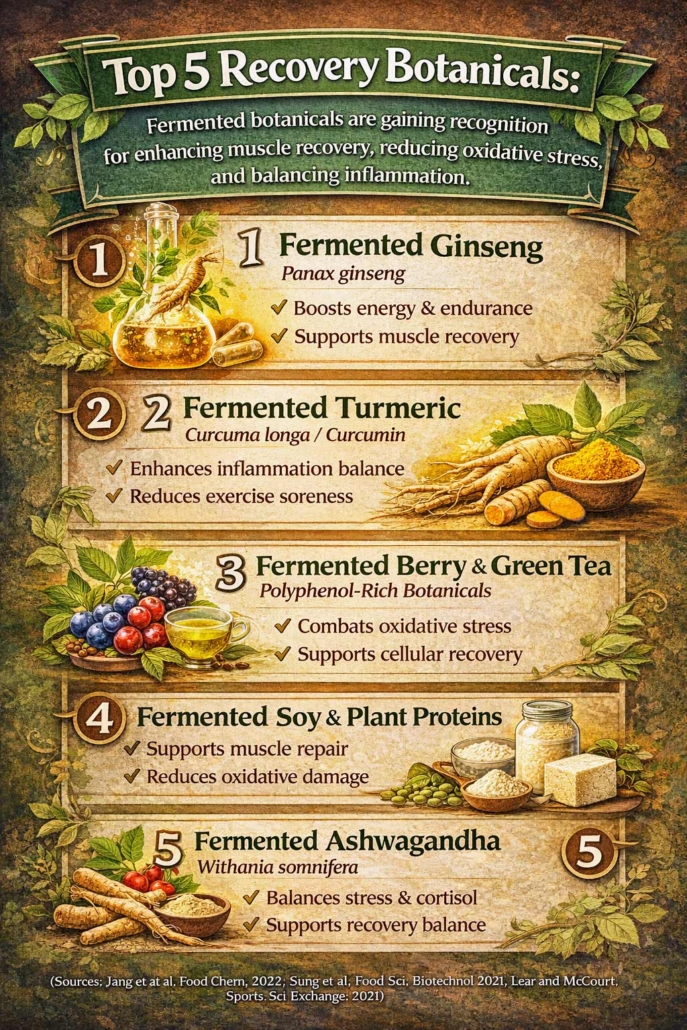 Fermented botanicals such as ginseng and polyphenol-rich extracts can support fatigue reduction and energy replenishment, expanding recovery beyond muscle-focused benefits.